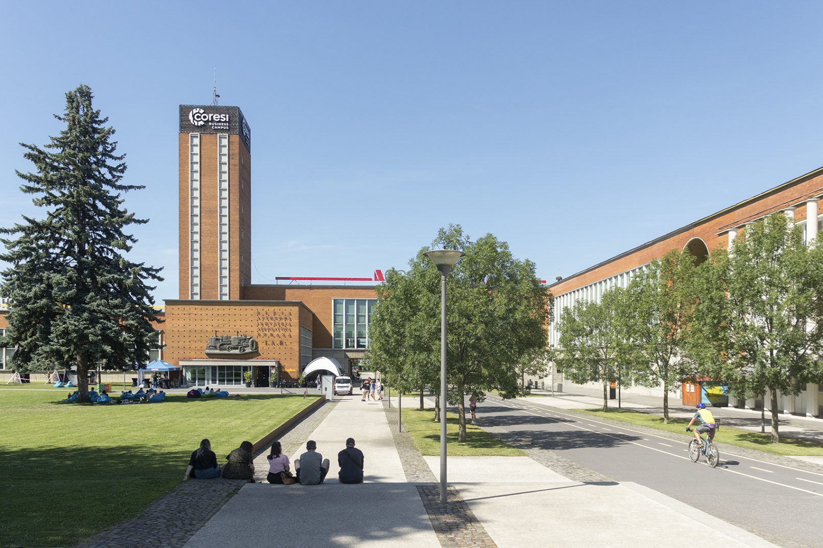 Die Entwurfshaltung ist geprägt durch den respektvollen Umgang mit dem baukulturellen Erbe der Zwischenkriegsmoderne. Der Entwurf schärft die existierenden räumlichen Leitideen durch geziehlten Rückbau und bauliche Ergänzungen. Das beeindruckende Ensemble wird im Hinblick auf die neuen Nutzungen zeitgemäß weiterentwickelt. Die offene Eingangsachse ist von Lavendelbeeten und Fliederbüschen flankiert. Ihre Oberfläche ist mit einem Natrusteinplattenbelag versehen. Die beiden großen, zusammenhängenden Grünflächen dienen der Erholung für die Mieter der angrenzenden Büroflächen; neu gepflanzte Birken, ein linearer Themengarten und Nutzfelder für Sport und Gastronomie, sowie eine Piateta vor dem Protokoll-Gebäude gliedern den Raum und erweitern das Angebot an nutzbaren Freiflächen.