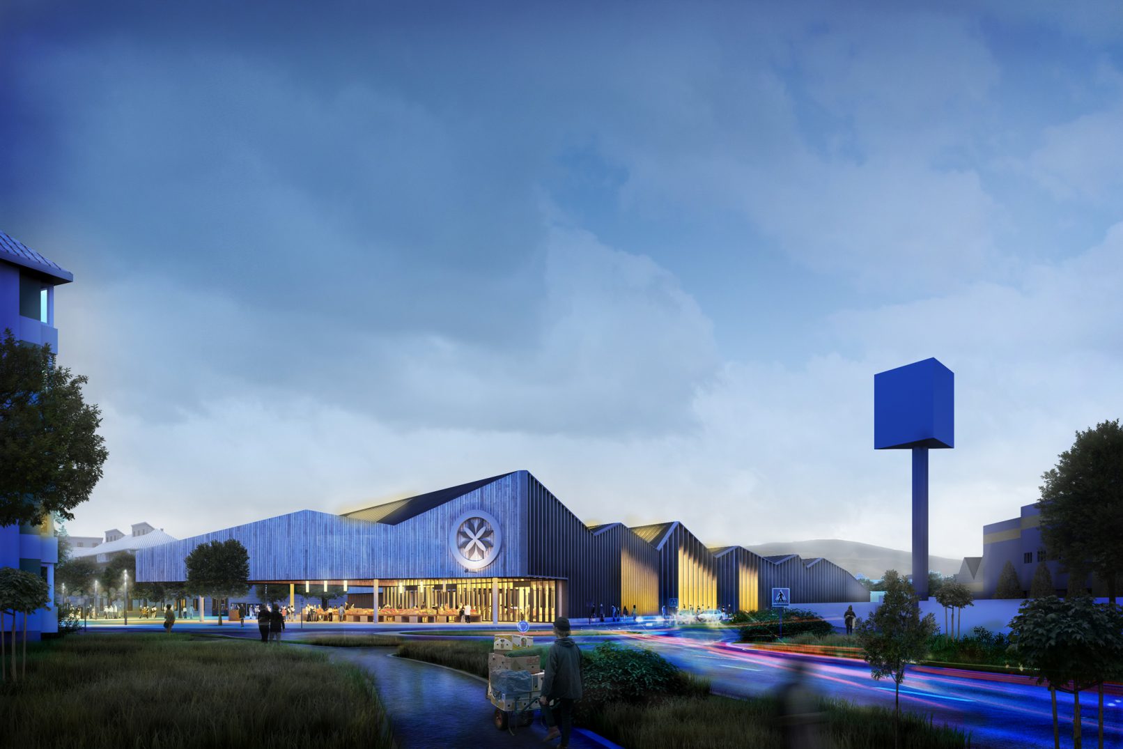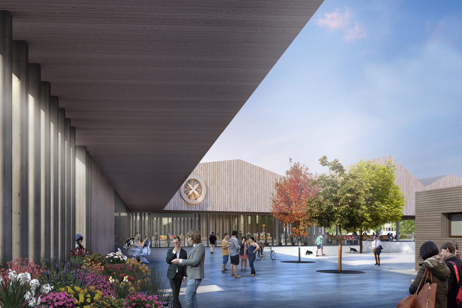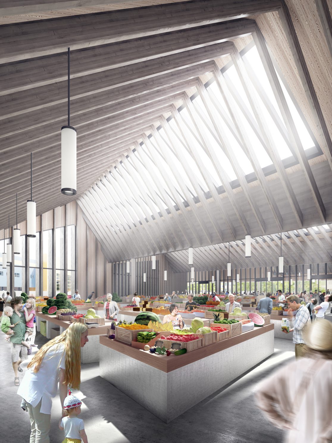 Die Markthalle grenzt sich in Ihrer Materialität, maßstäblich und räumlich von den umgebenden Gewerbehallen ab; Konstruktion und die Oberflächenbehandlung beruhen auf der reichen Holzbau-Tradition der Region.