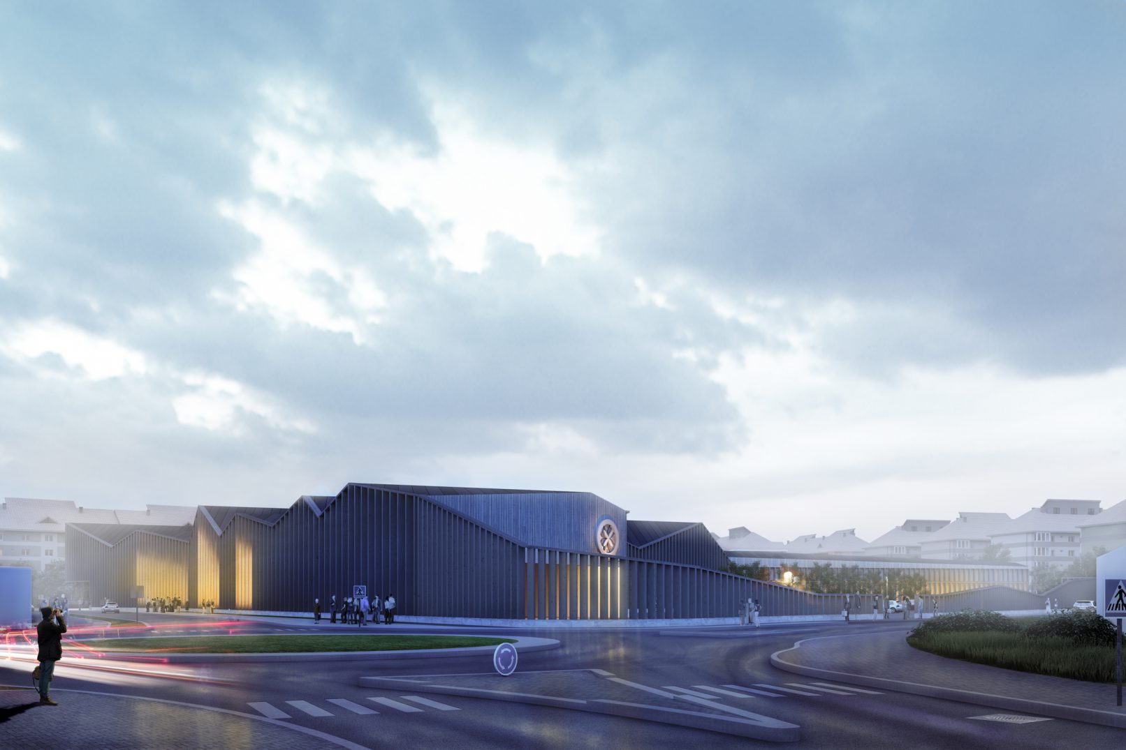 Die Silhouette der Halle bezieht sich auf die unterschiedlichen Gegebenheiten der Umgebung und ist auf eine Weise ausdifferenziert, die je nach Blickrichtung als Abschluss der bewegten Dachlandschaft der Stadt oder als Reaktion auf die Bergkuppen der von hier aus sichtbaren Karpaten verstanden werden kann.