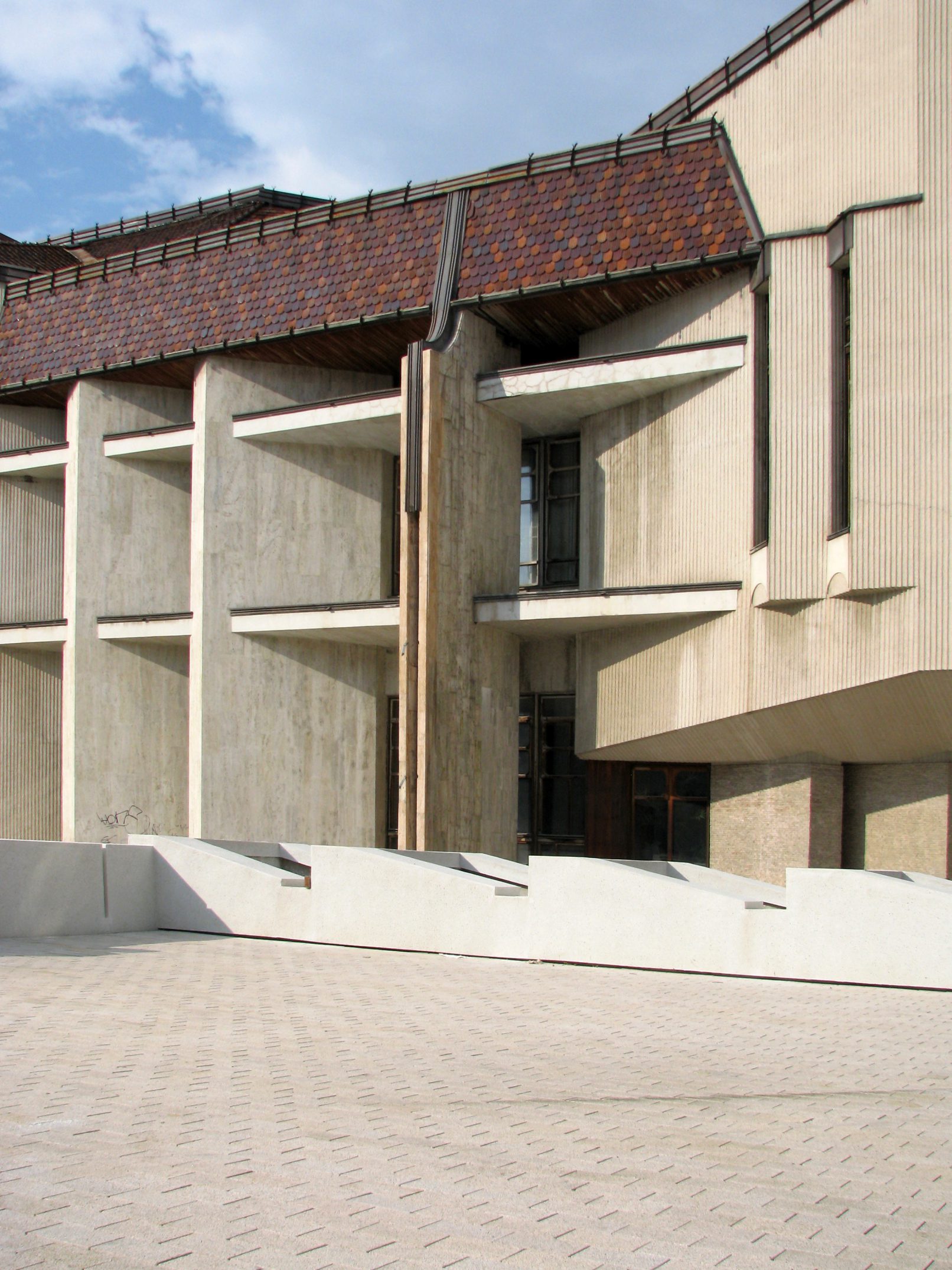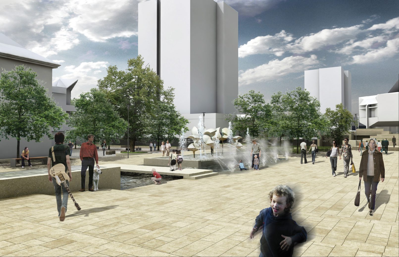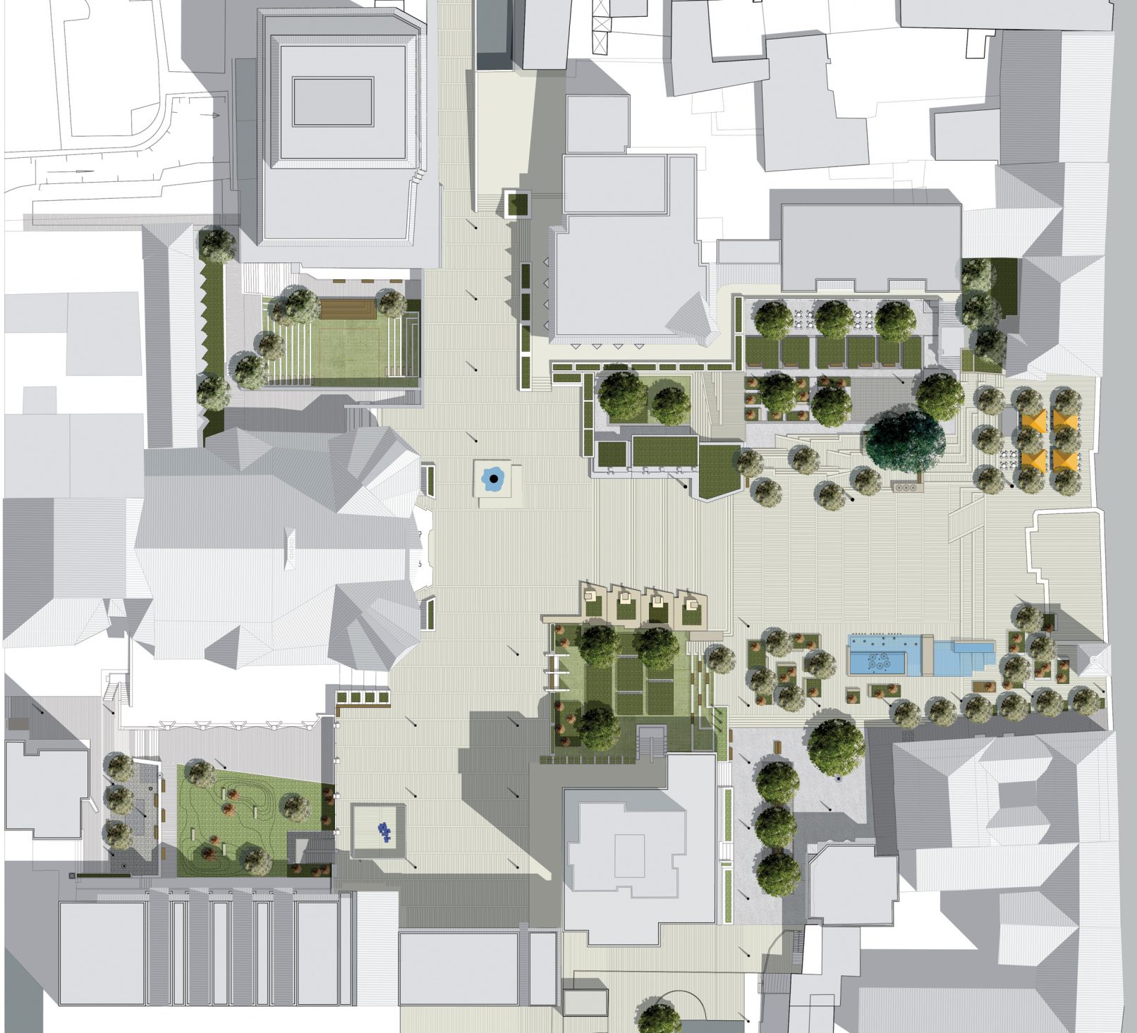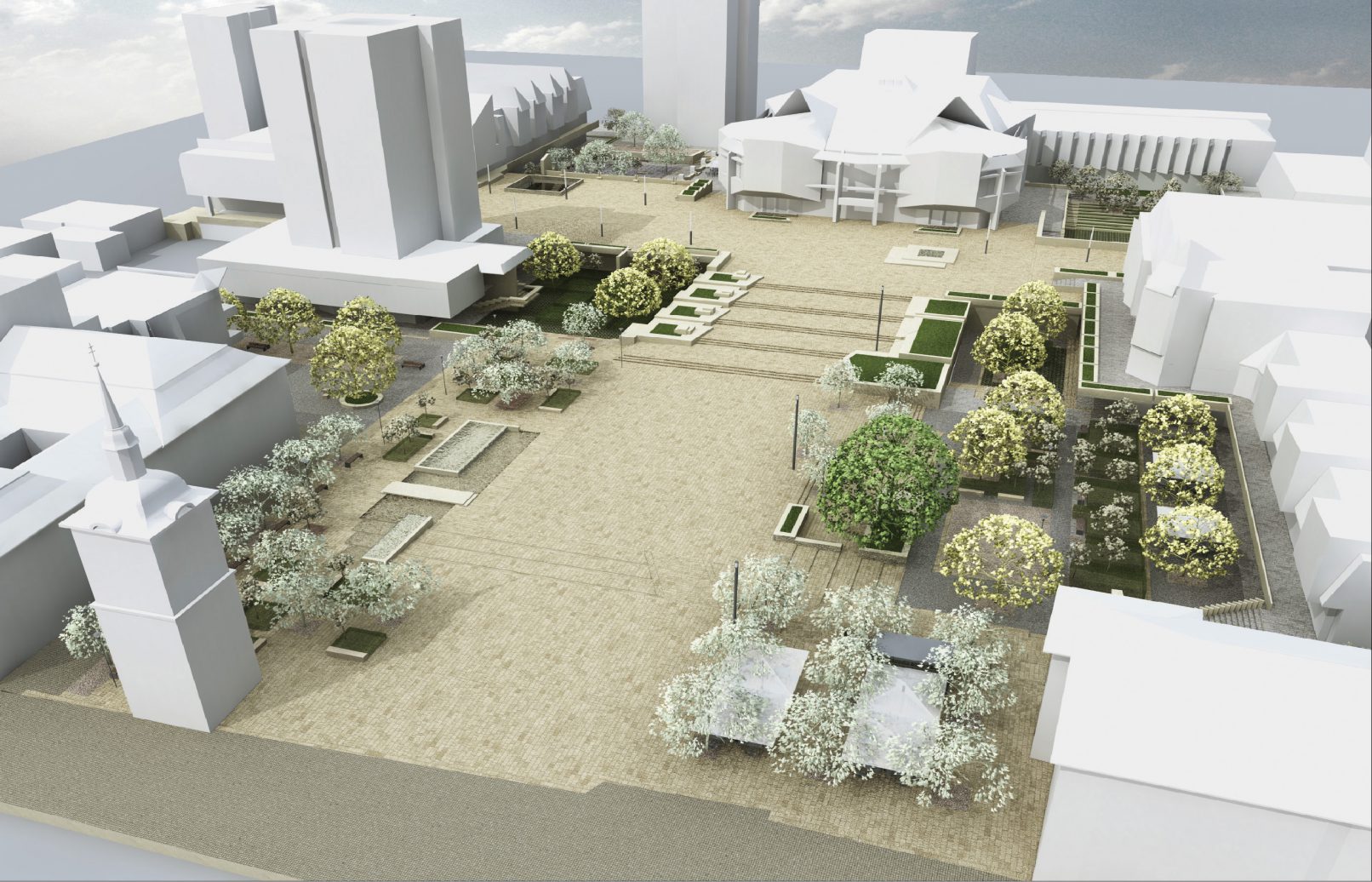Platzensembles von den im Laufe der Zeit dazugekommenen Schichten (Beleuchtung, Mobiliar, Umbauten) schärft die Grundidee der originalen Planung. Besonderer Wert wird auf die Stärkung der zentralen Achse zwischen Hauptzugang und Theater durch ein Lichtkonzept, Bäume und eine klare Linienführung gelegt. Die Seiten werden in Ihrem ursprünglichen Motiv als städtische Gärten durch landschaftsplanerische Elemente gestärkt. Die Planung beinhaltet neben der Neugestaltung des öffentlichen Raums auch die vollständige Sanierung der gesamten, teilweise unterirdischen Betonstruktur, die dem Platz seine markante Topografie gibt.