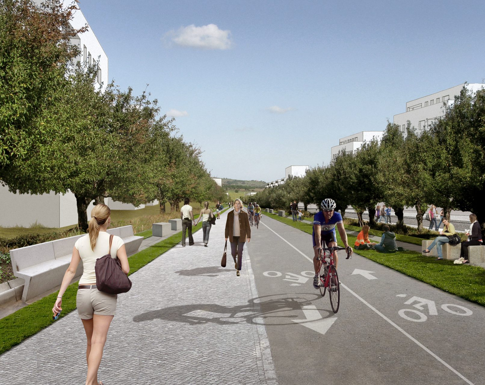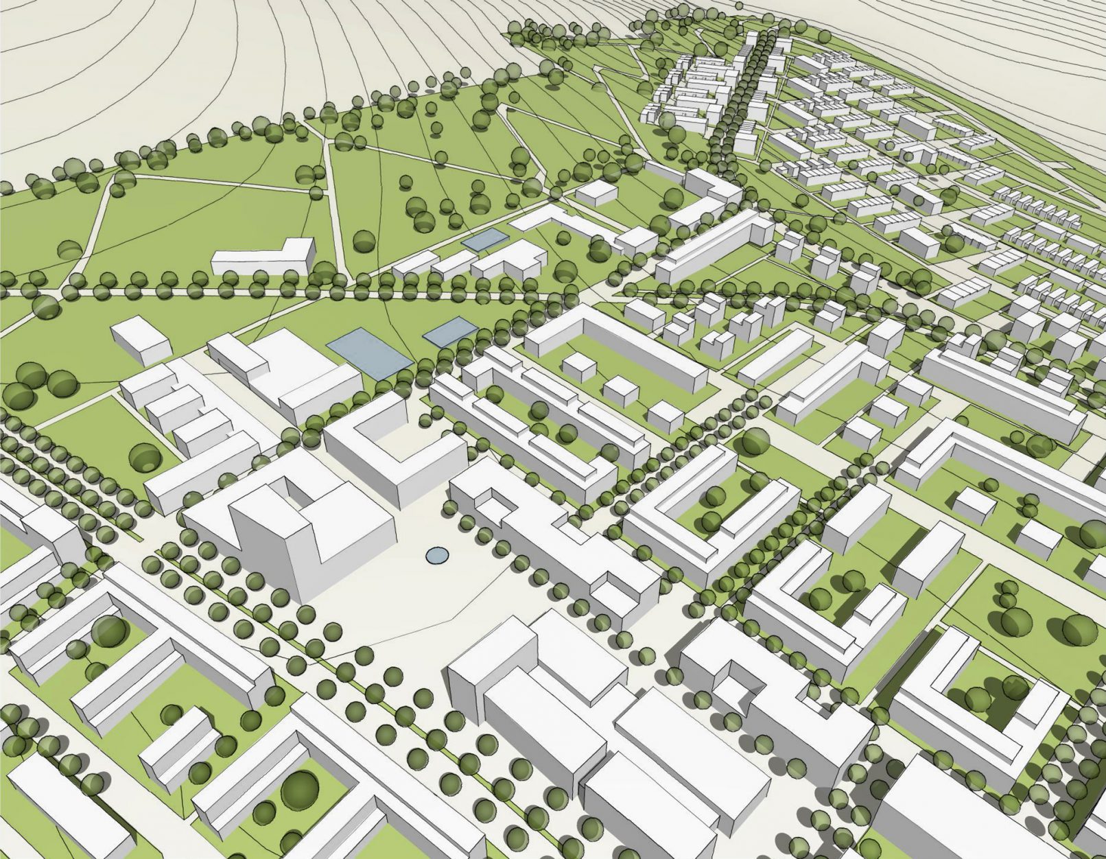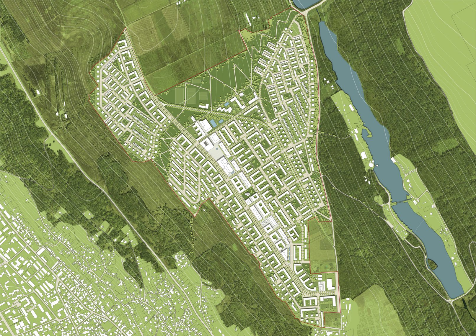Das Zentrum des neuen Quartiers liegt auf einem Bergrücken,Gebäude und Öffentliche Räume sind entlang einer Fußgängerachse gruppiert, die zum neuen Park führt. Die Wohngebiete liegen auf den beiden Hängen. Die vorgeschlagene Parzellenstruktur und Orientierung gewährleistet die nachhaltige und effiziente Nutzung von Flächen und Ressourcen. Variable Gebäudetypologien und das Netzwerk von attraktiven Grünflächen und fußläufiger Erschließung innerhalb des Quartiers sorgen für hohe Wohnqualität.