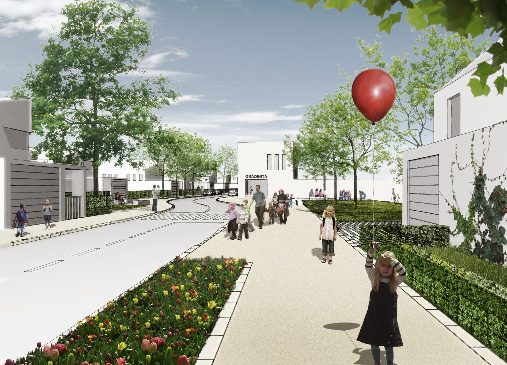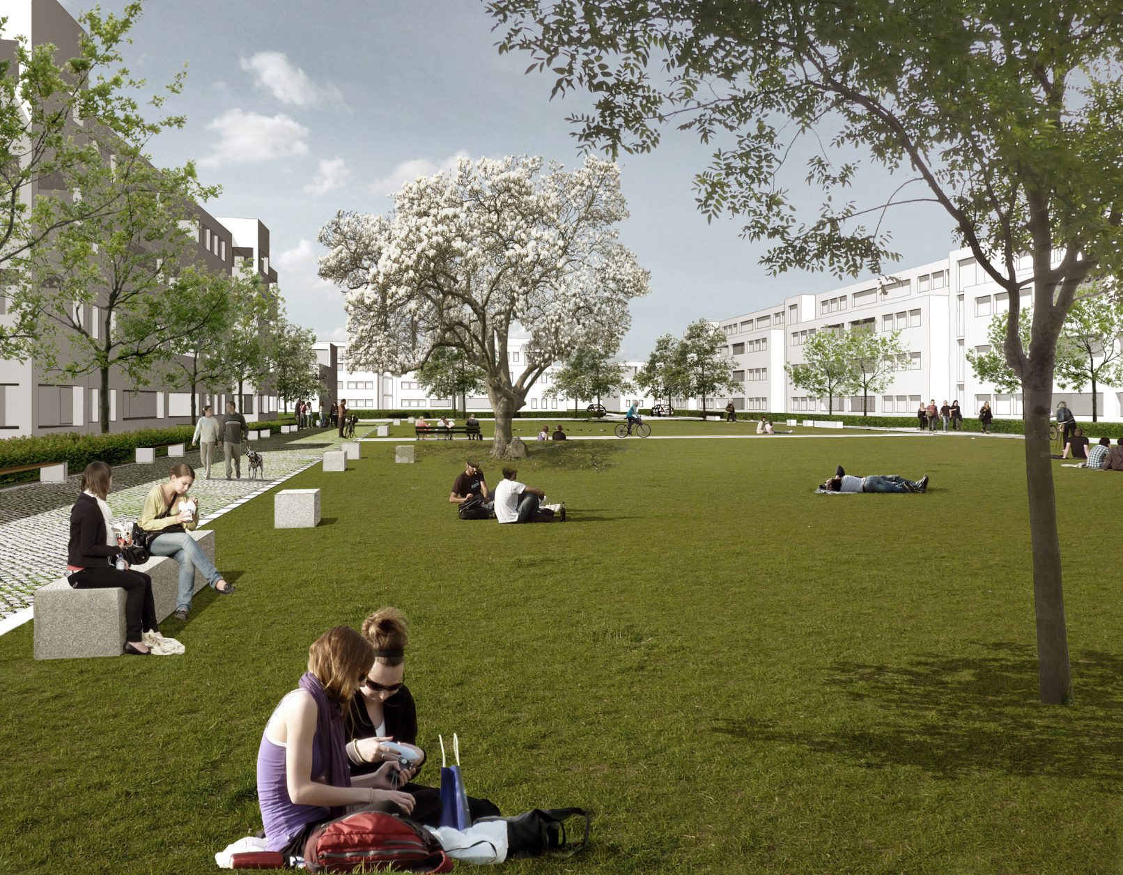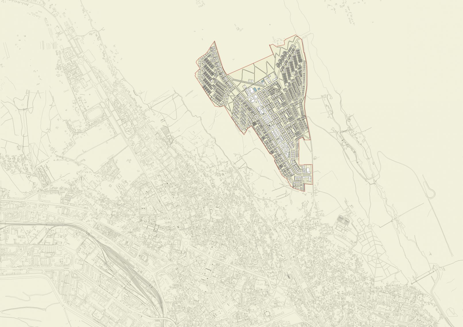 Das Zentrum des neuen Quartiers liegt auf einem Bergrücken,Gebäude und Öffentliche Räume sind entlang einer Fußgängerachse gruppiert, die zum neuen Park führt. Die Wohngebiete liegen auf den beiden Hängen. Die vorgeschlagene Parzellenstruktur und Orientierung gewährleistet die nachhaltige und effiziente Nutzung von Flächen und Ressourcen. Variable Gebäudetypologien und das Netzwerk von attraktiven Grünflächen und fußläufiger Erschließung innerhalb des Quartiers sorgen für hohe Wohnqualität.