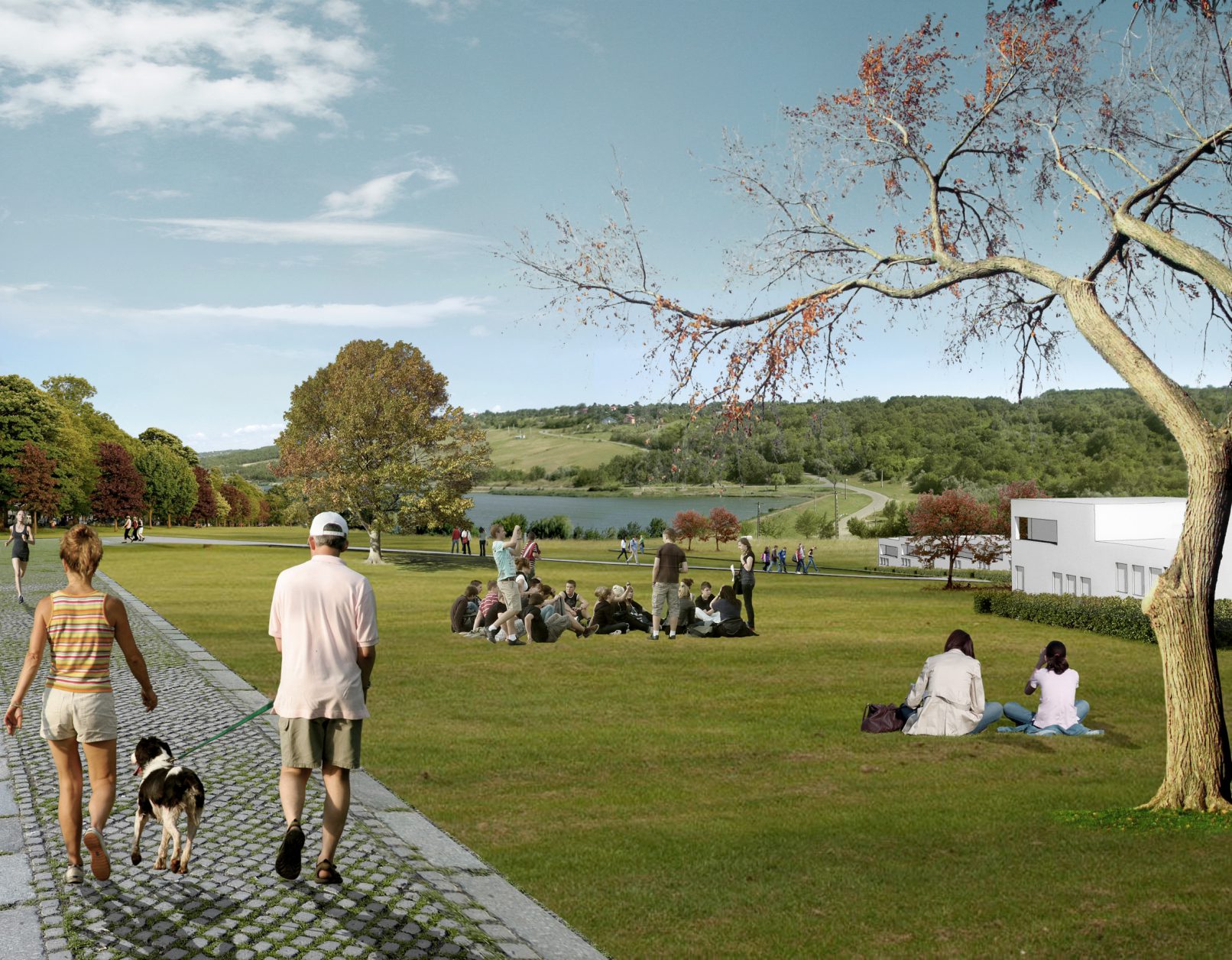 Unser Wettbewerbsbeitrag legt besonderen Wert auf die Anbindung an die bestehende Stadtstruktur. Das neue Wohnviertel bezieht sich räumlich und organisatorisch auf nahegelegene Seen und einen Wald, sowie die markante Topografie mit Ihren Ausblicken in die Landschaft. Die Erschließung erhält die historische Wegestruktur der ehemaligen Weinberge.
