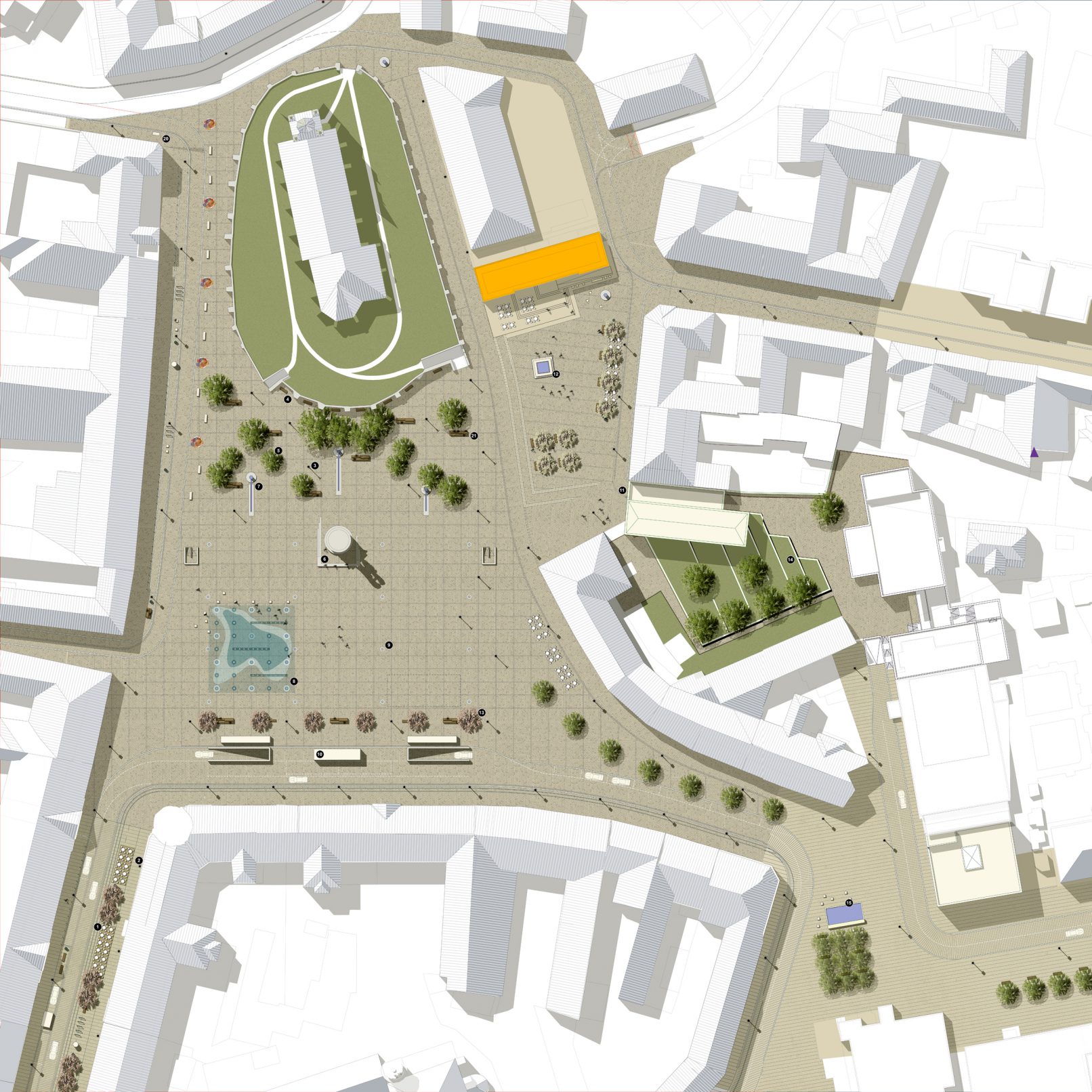 Spaţiul nou creat poate fi utilizat flexibil pentru expoziţii sau evenimente şi dispune de o terasă. Elementul arhitectural al nivelului din sticlă semnalizează funcţiunea publică a clădirii şi o asociază cu cea a muzeului de istorie, aflată pe frontul estic al pieţei. Spaţiile sanitare, anexe şi tehnice sînt grupate într-un volum mascat în spatele galeriei. În faţa intrării principale este amenajată o terasă a cafenelei.