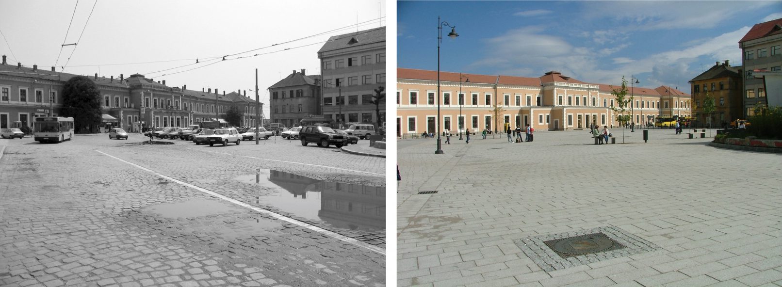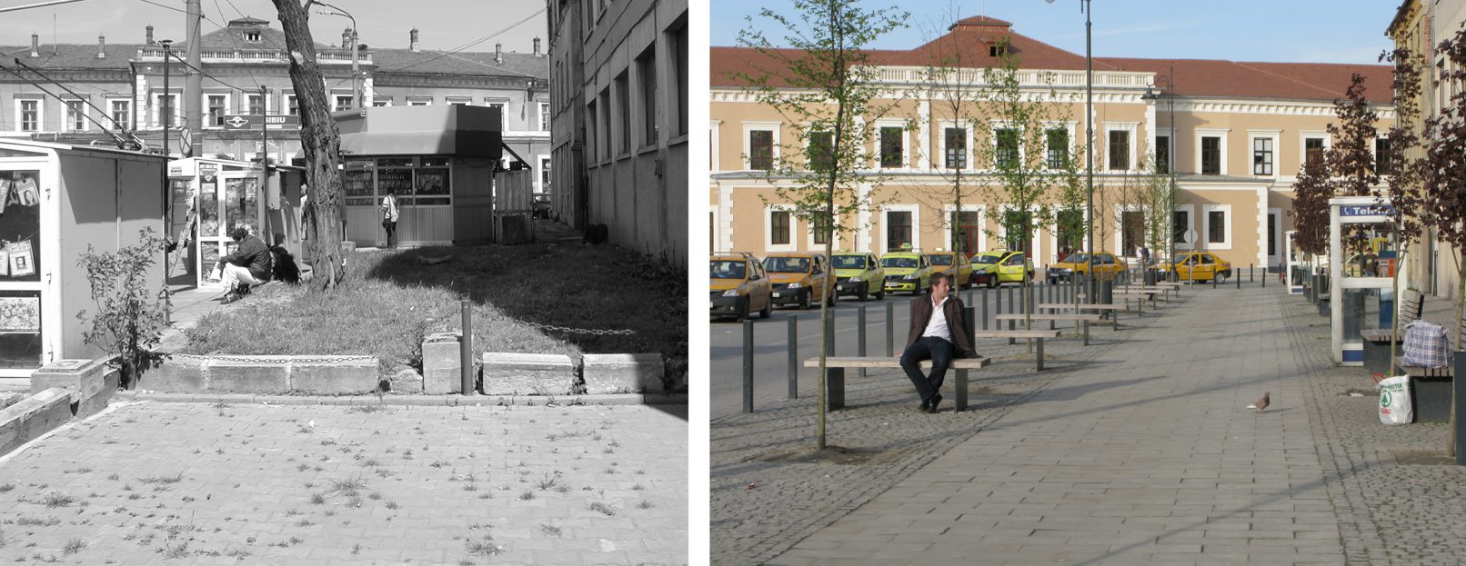 Durch umfassende Abbrucharbeiten während des Staatssozialismus klafft seit seinem abrupten Ende vor dem Bahnhof räumlich und funktional ein großes Loch im Stadtkörper von Sibiu (Hermannstadt).