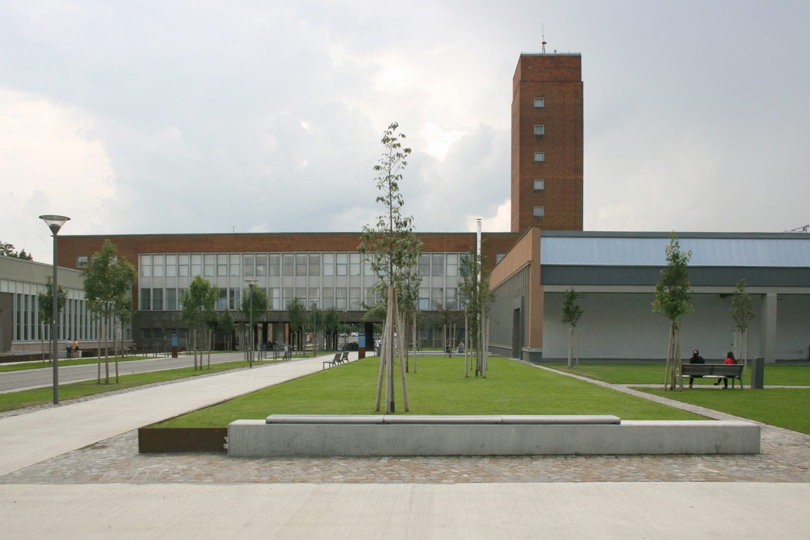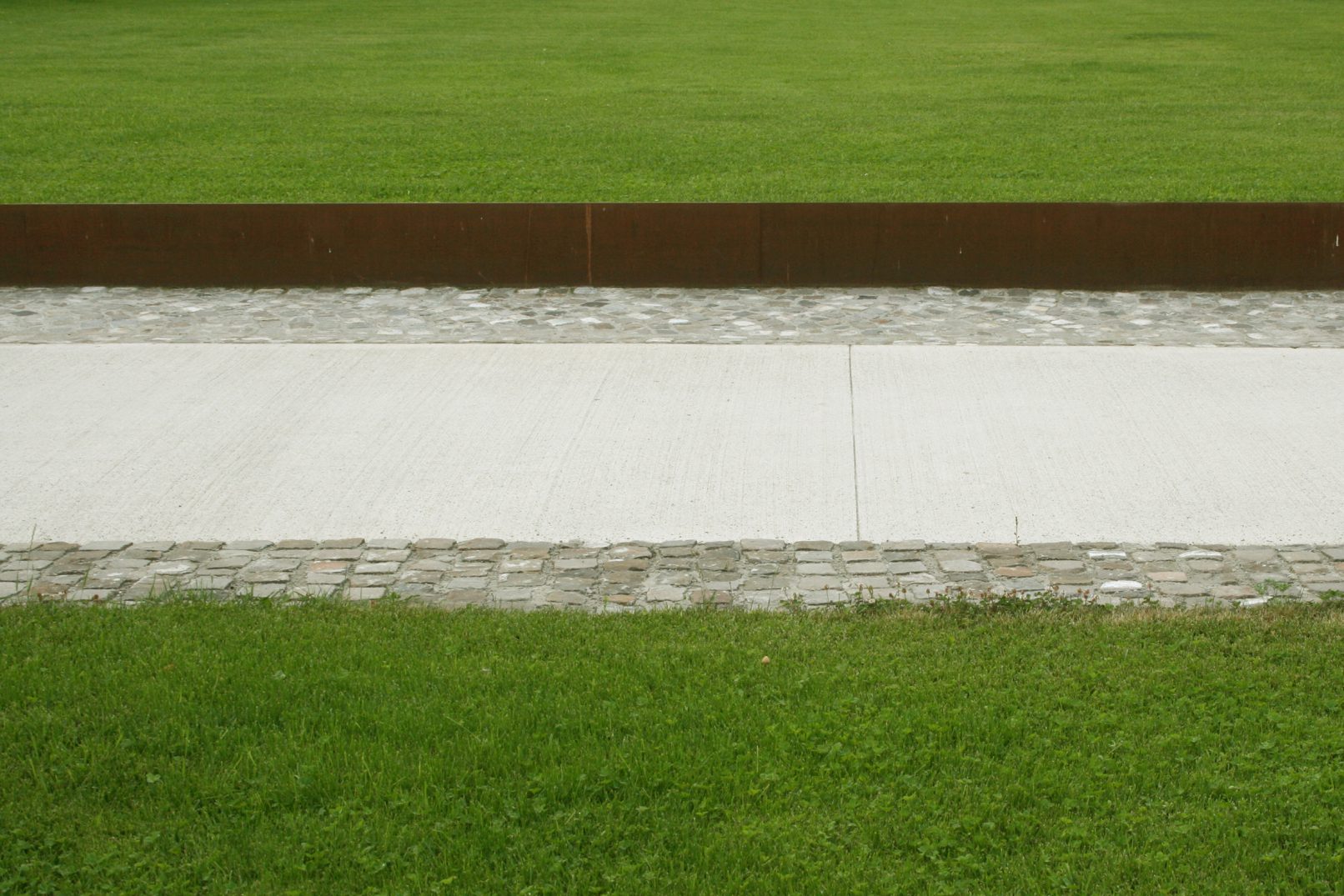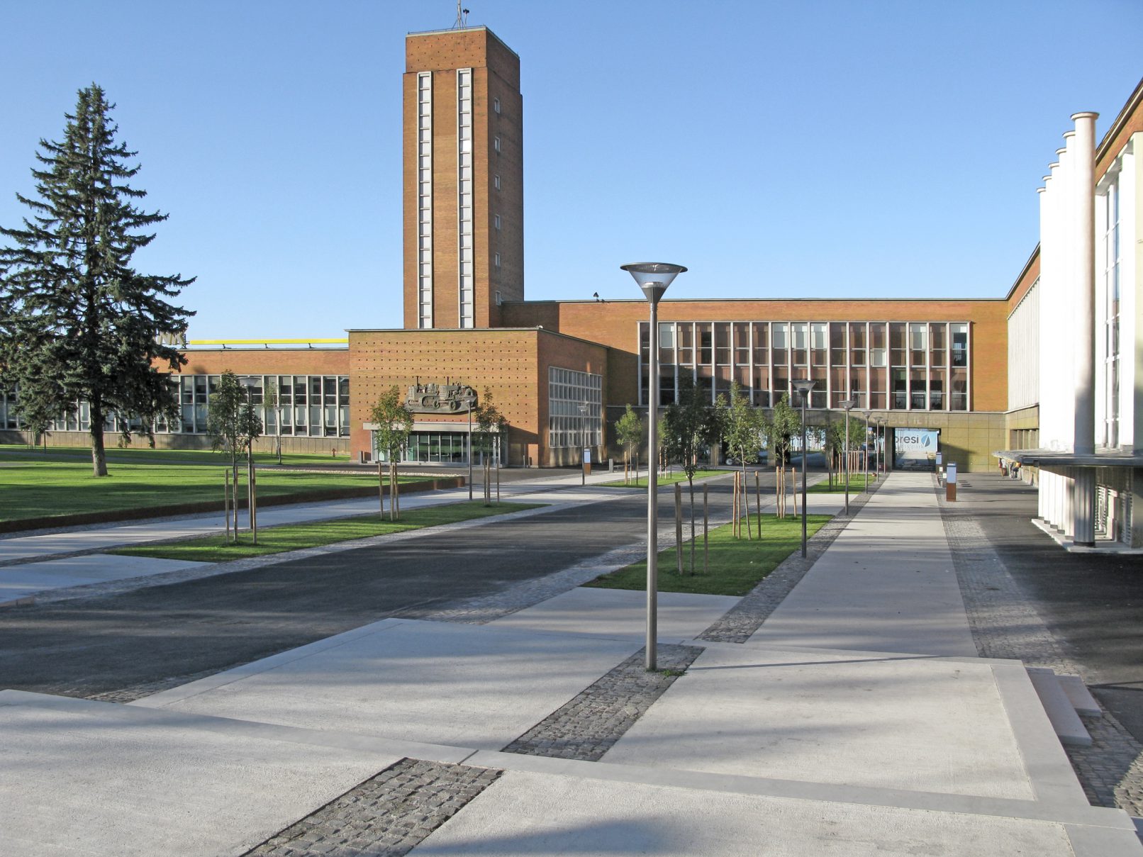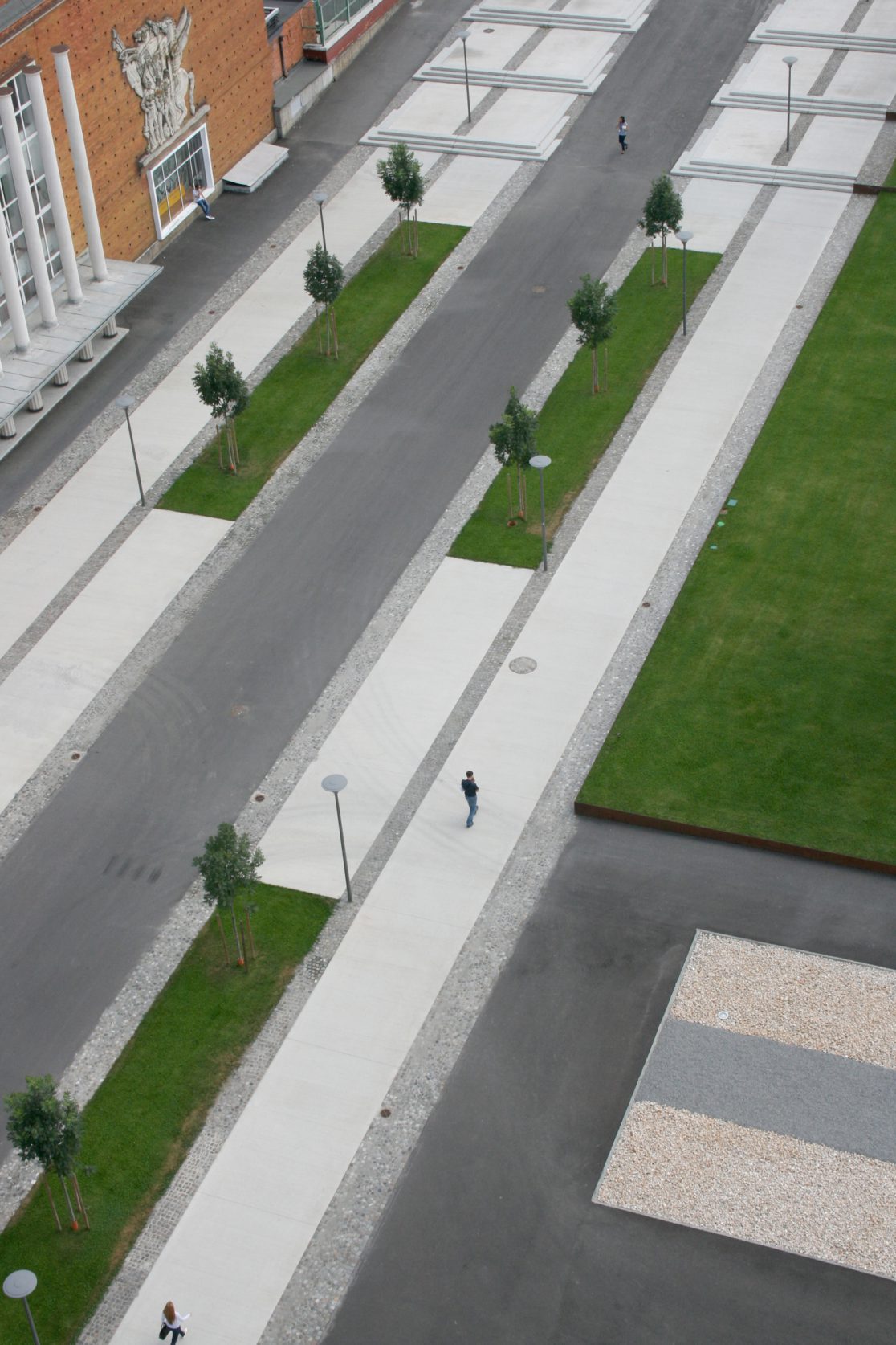 Die Entwurfshaltung ist geprägt durch den respektvollen Umgang mit dem baukulturellen Erbe der Zwischenkriegsmoderne. Der Entwurf schärft die existierenden räumlichen Leitideen durch geziehlten Rückbau und bauliche Ergänzungen. Das beeindruckende Ensemble wird im Hinblick auf die neuen Nutzungen zeitgemäß weiterentwickelt. Die offene Eingangsachse ist von Lavendelbeeten und Fliederbüschen flankiert. Ihre Oberfläche ist mit einem Natrusteinplattenbelag versehen. Die beiden großen, zusammenhängenden Grünflächen dienen der Erholung für die Mieter der angrenzenden Büroflächen; neu gepflanzte Birken, ein linearer Themengarten und Nutzfelder für Sport und Gastronomie, sowie eine Piateta vor dem Protokoll-Gebäude gliedern den Raum und erweitern das Angebot an nutzbaren Freiflächen.