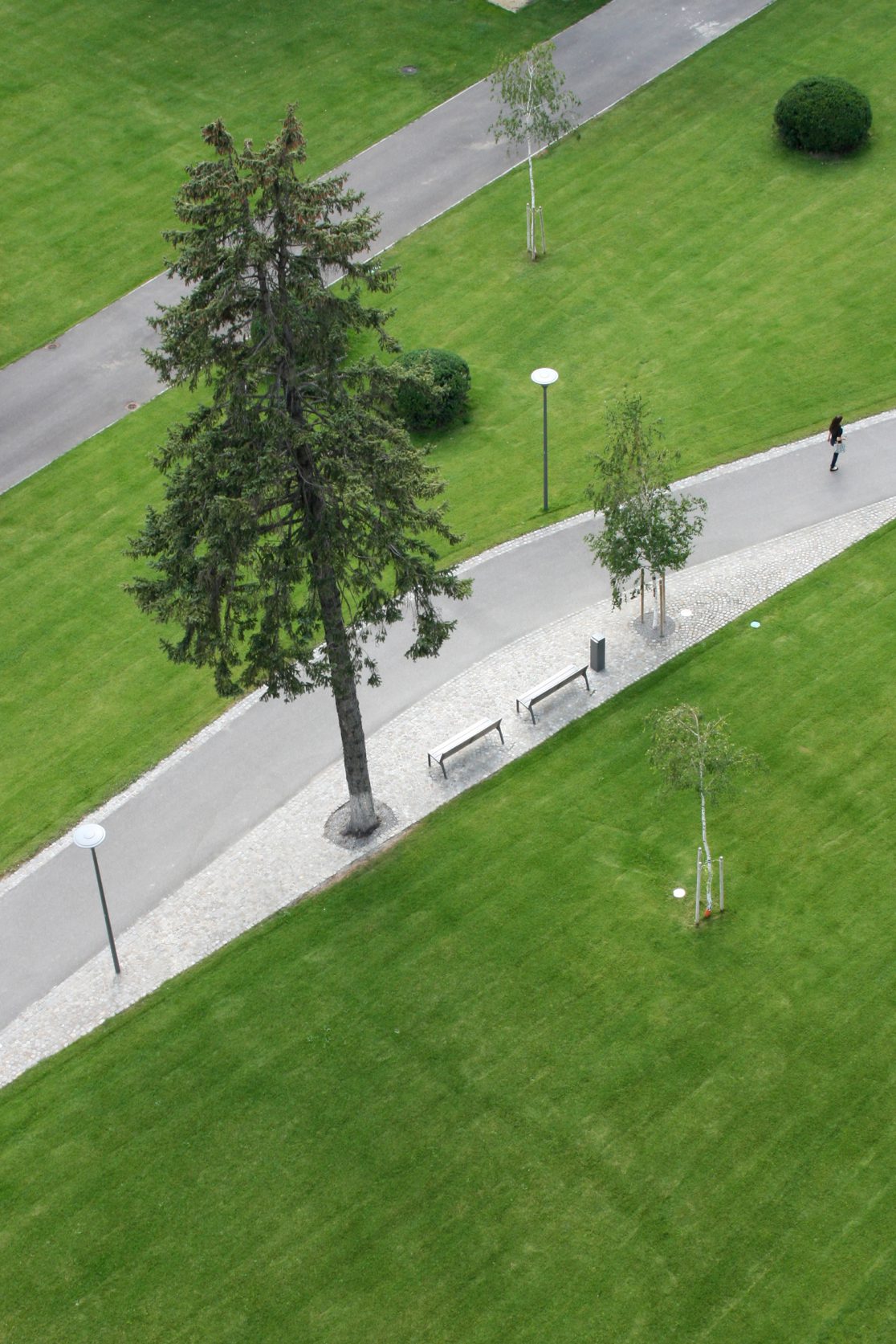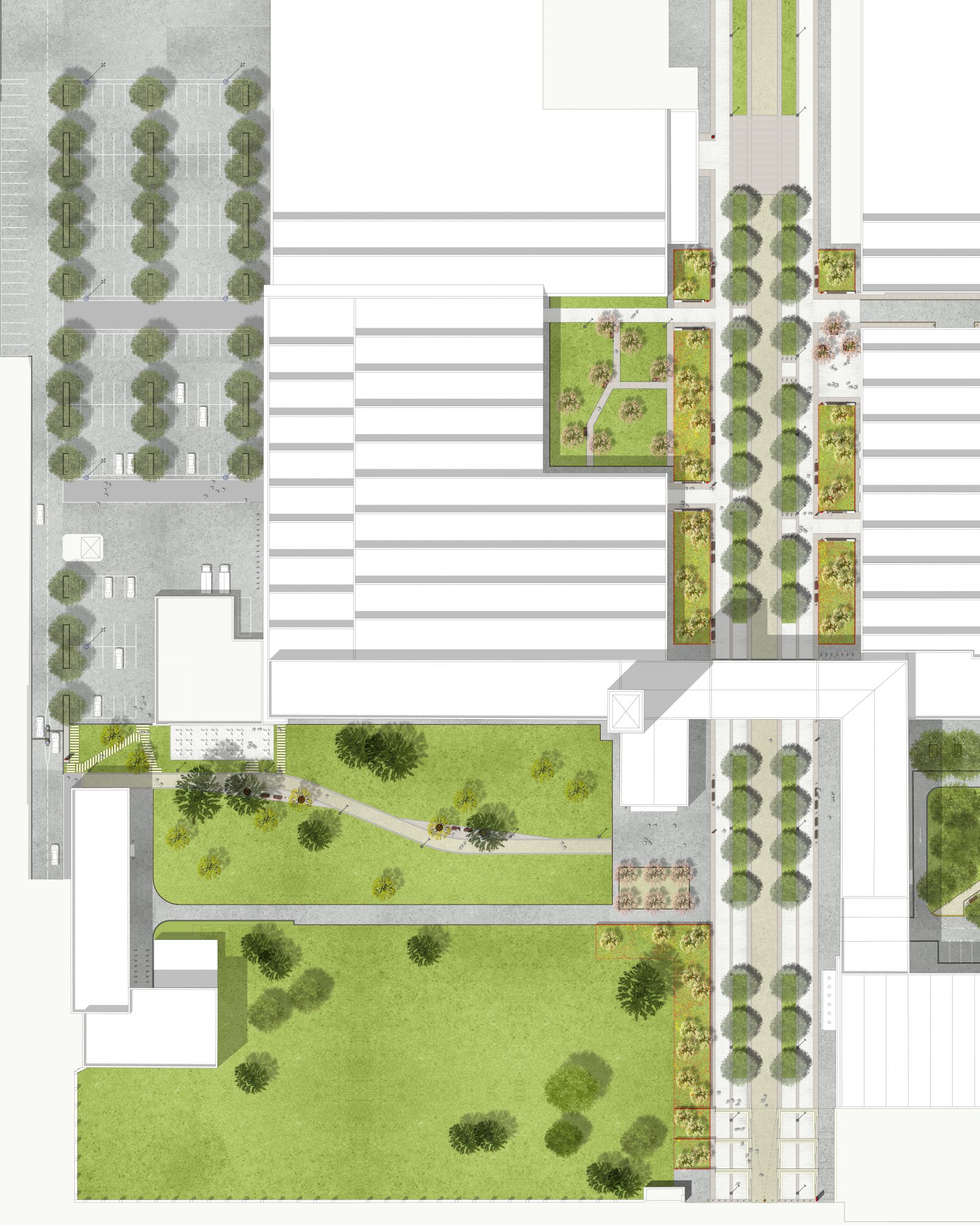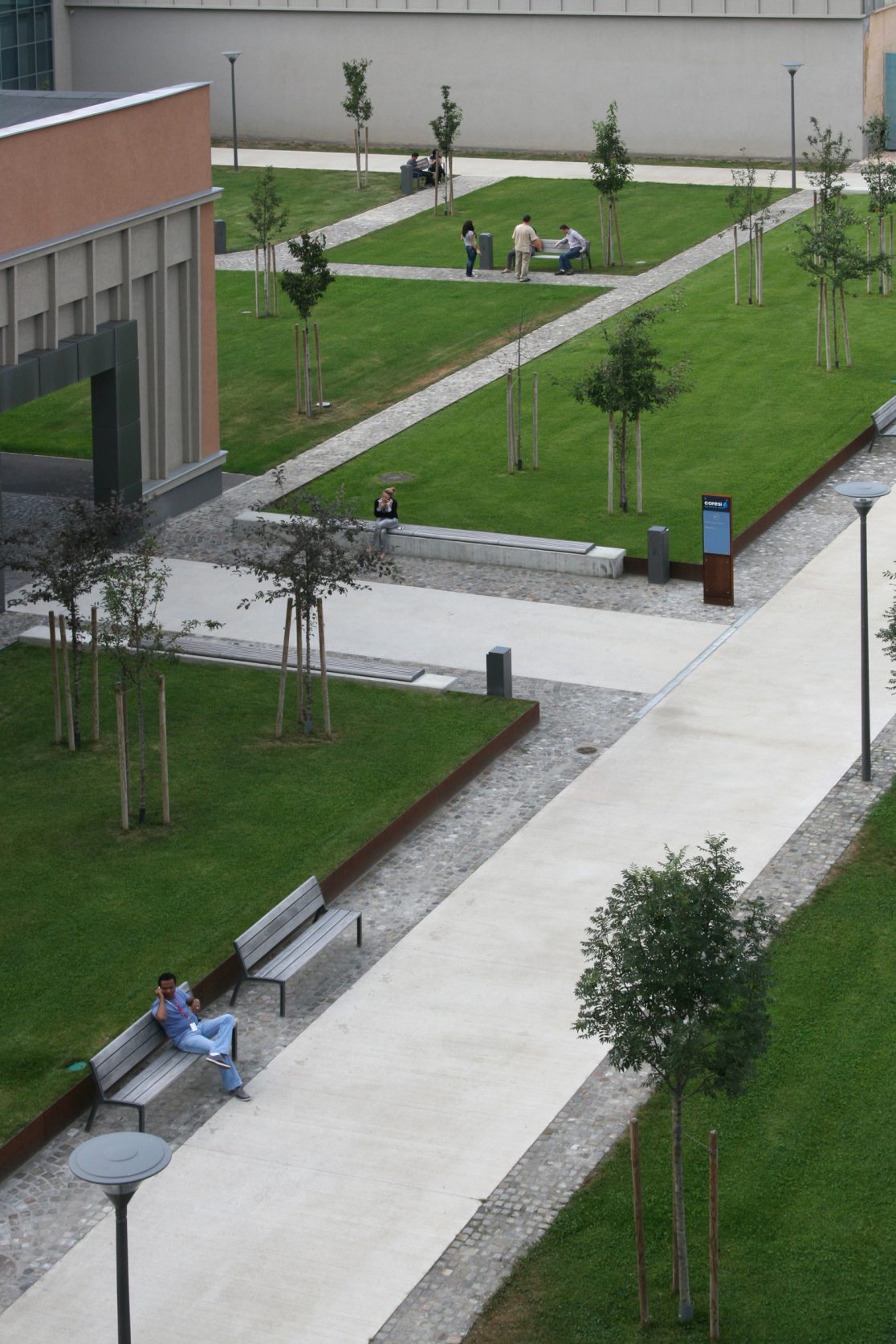 Die Entwurfshaltung ist geprägt durch den respektvollen Umgang mit dem baukulturellen Erbe der Zwischenkriegsmoderne. Der Entwurf schärft die existierenden räumlichen Leitideen durch geziehlten Rückbau und bauliche Ergänzungen. Das beeindruckende Ensemble wird im Hinblick auf die neuen Nutzungen zeitgemäß weiterentwickelt. Die offene Eingangsachse ist von Lavendelbeeten und Fliederbüschen flankiert. Ihre Oberfläche ist mit einem Natrusteinplattenbelag versehen. Die beiden großen, zusammenhängenden Grünflächen dienen der Erholung für die Mieter der angrenzenden Büroflächen; neu gepflanzte Birken, ein linearer Themengarten und Nutzfelder für Sport und Gastronomie, sowie eine Piateta vor dem Protokoll-Gebäude gliedern den Raum und erweitern das Angebot an nutzbaren Freiflächen.