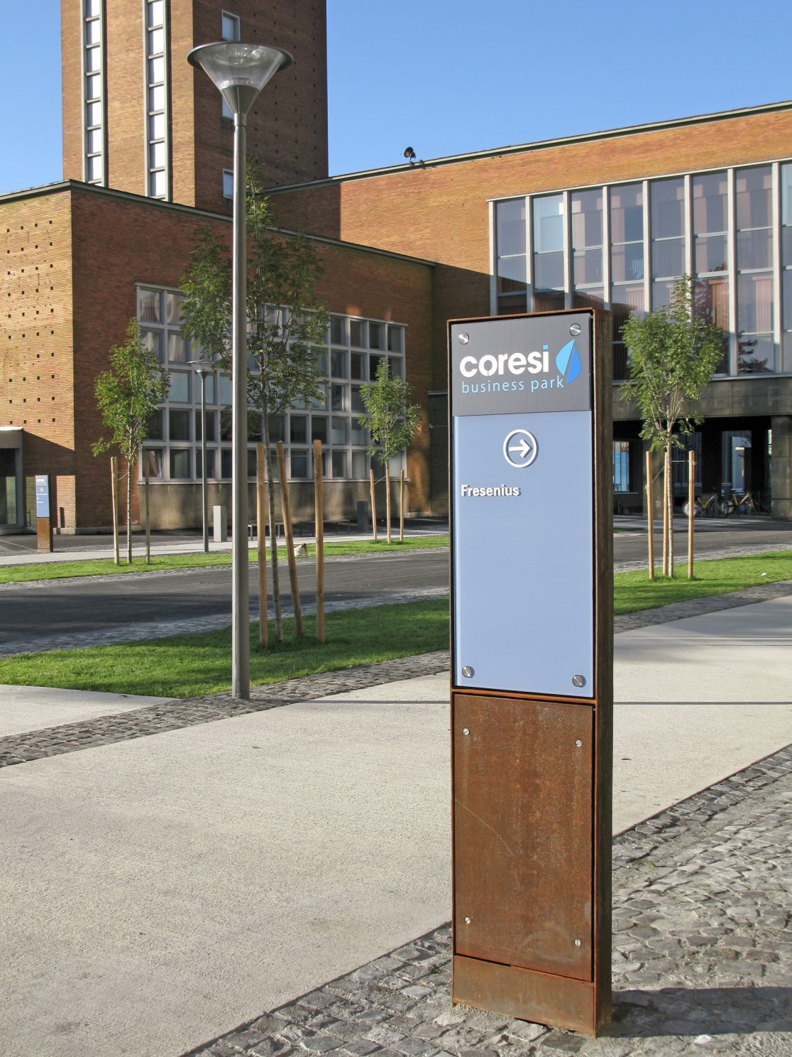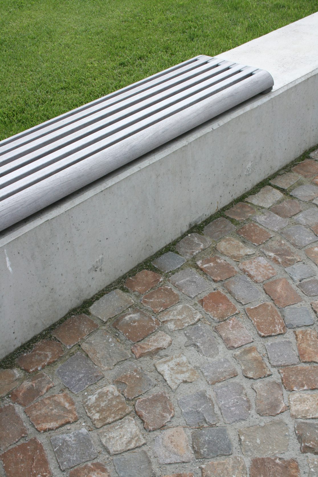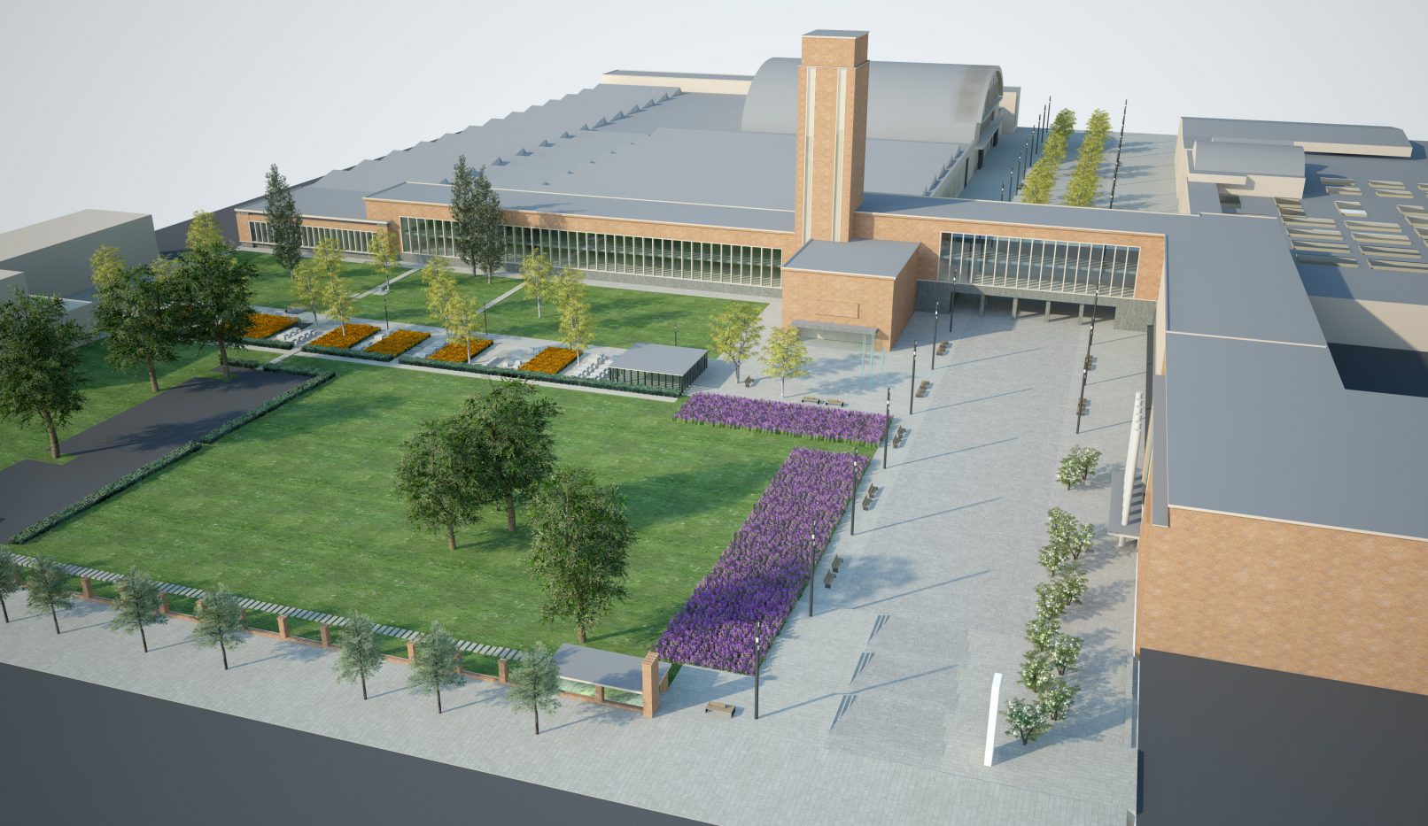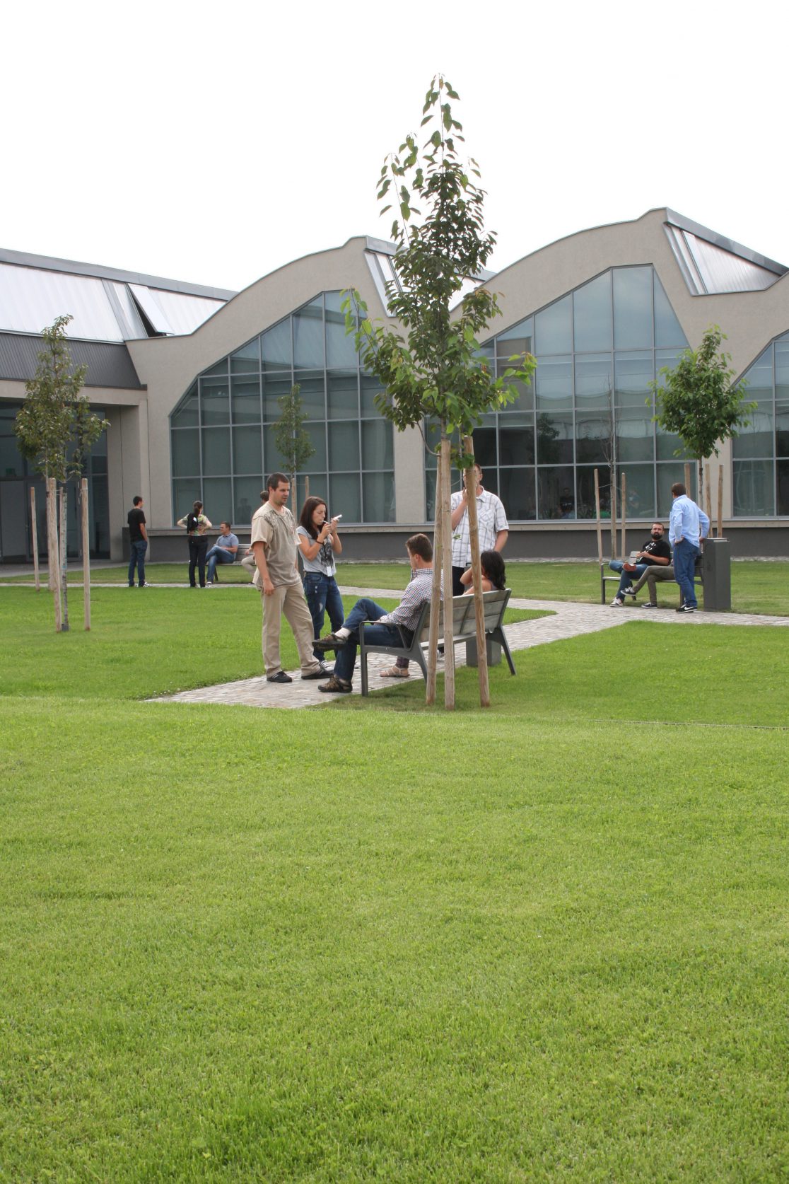 Die Entwurfshaltung ist geprägt durch den respektvollen Umgang mit dem baukulturellen Erbe der Zwischenkriegsmoderne. Der Entwurf schärft die existierenden räumlichen Leitideen durch geziehlten Rückbau und bauliche Ergänzungen. Das beeindruckende Ensemble wird im Hinblick auf die neuen Nutzungen zeitgemäß weiterentwickelt. Die offene Eingangsachse ist von Lavendelbeeten und Fliederbüschen flankiert. Ihre Oberfläche ist mit einem Natrusteinplattenbelag versehen. Die beiden großen, zusammenhängenden Grünflächen dienen der Erholung für die Mieter der angrenzenden Büroflächen; neu gepflanzte Birken, ein linearer Themengarten und Nutzfelder für Sport und Gastronomie, sowie eine Piateta vor dem Protokoll-Gebäude gliedern den Raum und erweitern das Angebot an nutzbaren Freiflächen.