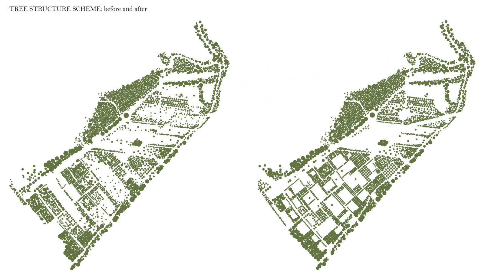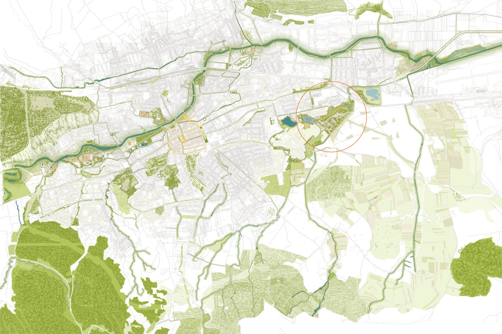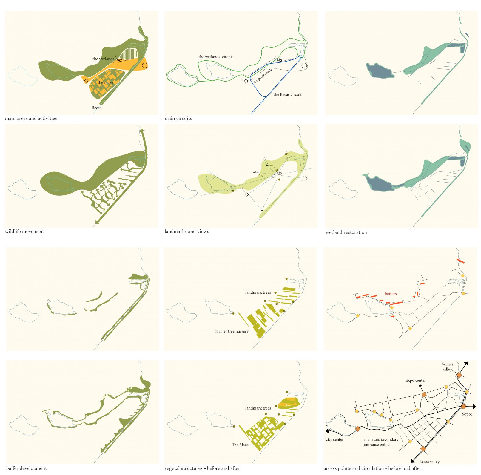 Parcul Est articulează punctul de întâlnire al văii Becașului cu zonele mlăștinoase din Gheorgheni. Fosta pepinieră conectează cele două habitate sălbatice și unește comunitățile urbane învecinate. Zonele mlăștinoase și umede sunt recondiționate, extinse și protejate pentru a deveni nucleul noului parc, prin biodiversitatea lor remarcabilă. Fosta pepinieră, care se află între zonele mlăștinoase și pârâul Becaș, este păstrată, făcută accesibilă și transformată într-o rețea de garduri vii, plantații, păduri mici și luminișuri. Această rețea de spații verzi publice de diferite dimensiuni și atmosfere oferă o flexibilitate largă în utilizare și permite dezvoltarea în etape a parcului Est, în timp ce suprafețe mai mari sunt păstrate ca viitoare rezerve.