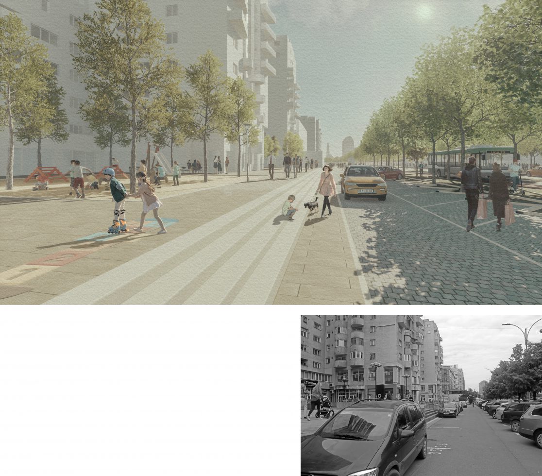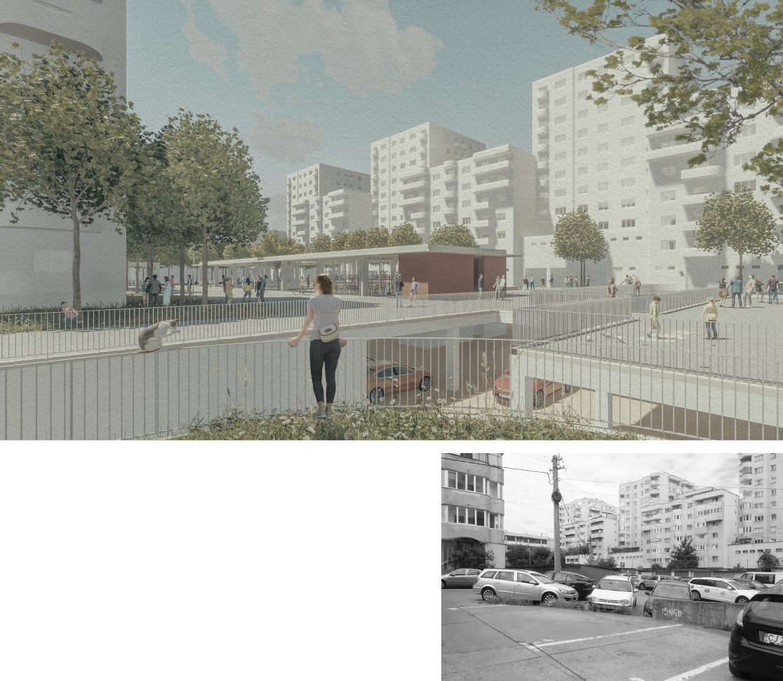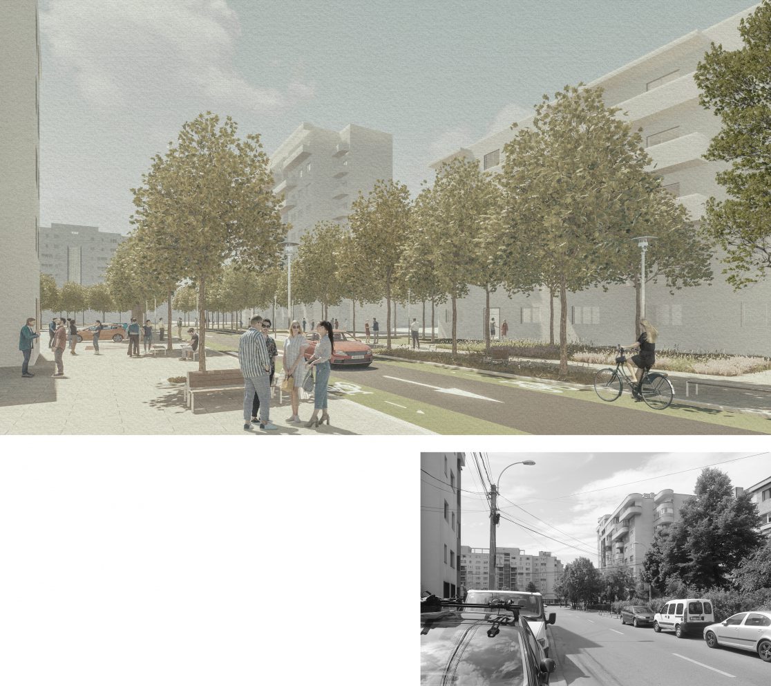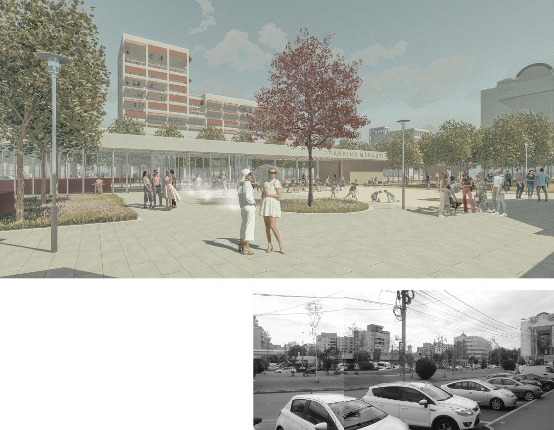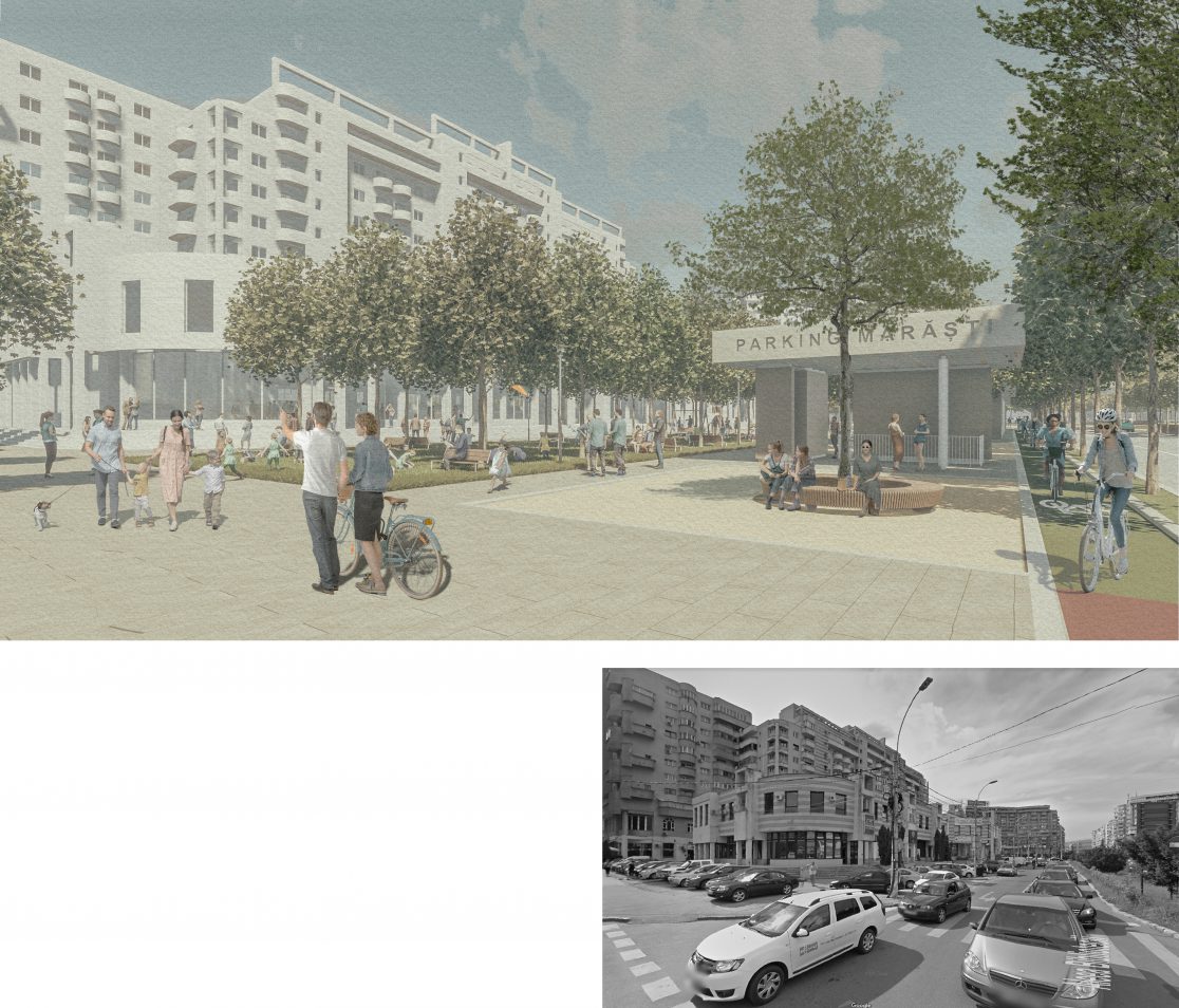 Regenerarea centrului de cartier Mărăști mizează pe concentrarea mașinilor în cinci parcaje noi de diferite tipuri, adaptate amplasamentelor disponibile. Reorganizarea spațiului public astfel eliberat prioritizează mobilitatea sustenabilă: pietoni, biciclete și transport public pe culoar dedicat. Suprafața spațiilor verzi este extinsă cu 30%. Un imobil cu locuințe sociale și dotări publice de cartier reconfigurează frontul estic al Pieței Mărăști, în încercarea de a reda coerență spațială ansamblului.
