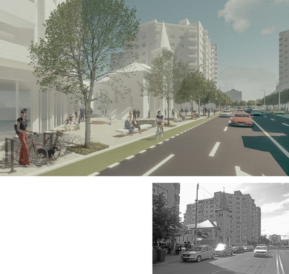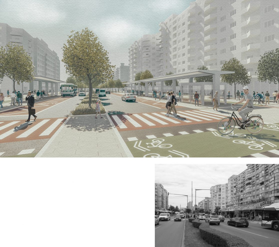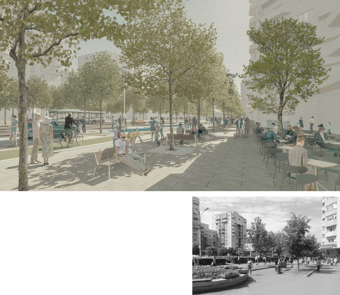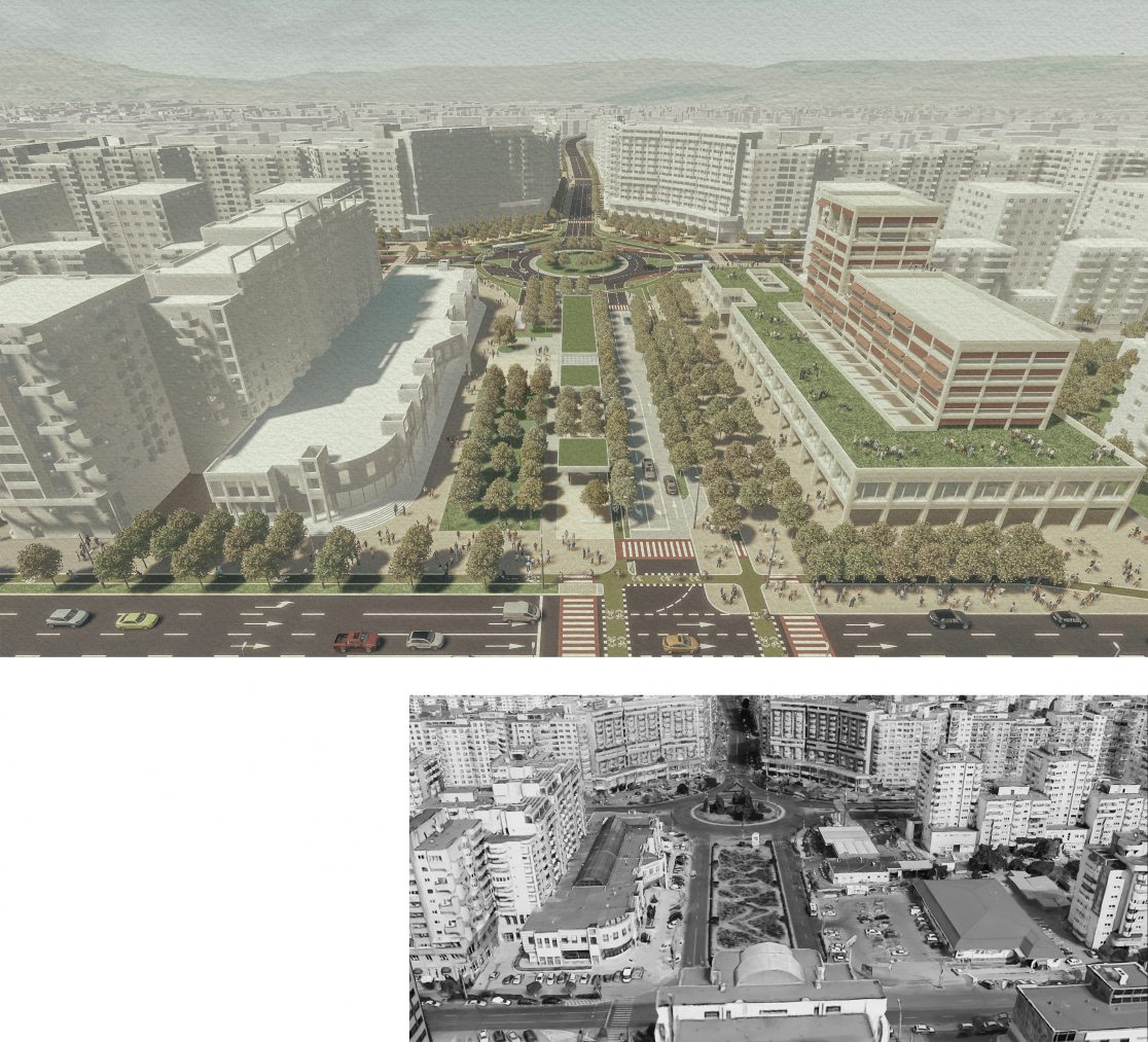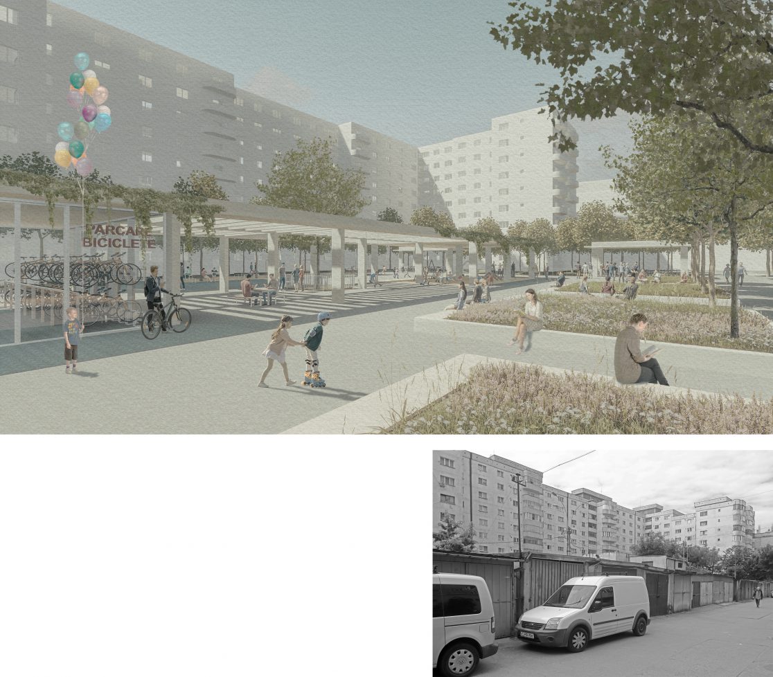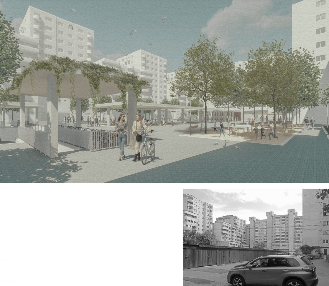 Regenerarea centrului de cartier Mărăști mizează pe concentrarea mașinilor în cinci parcaje noi de diferite tipuri, adaptate amplasamentelor disponibile. Reorganizarea spațiului public astfel eliberat prioritizează mobilitatea sustenabilă: pietoni, biciclete și transport public pe culoar dedicat. Suprafața spațiilor verzi este extinsă cu 30%. Un imobil cu locuințe sociale și dotări publice de cartier reconfigurează frontul estic al Pieței Mărăști, în încercarea de a reda coerență spațială ansamblului.