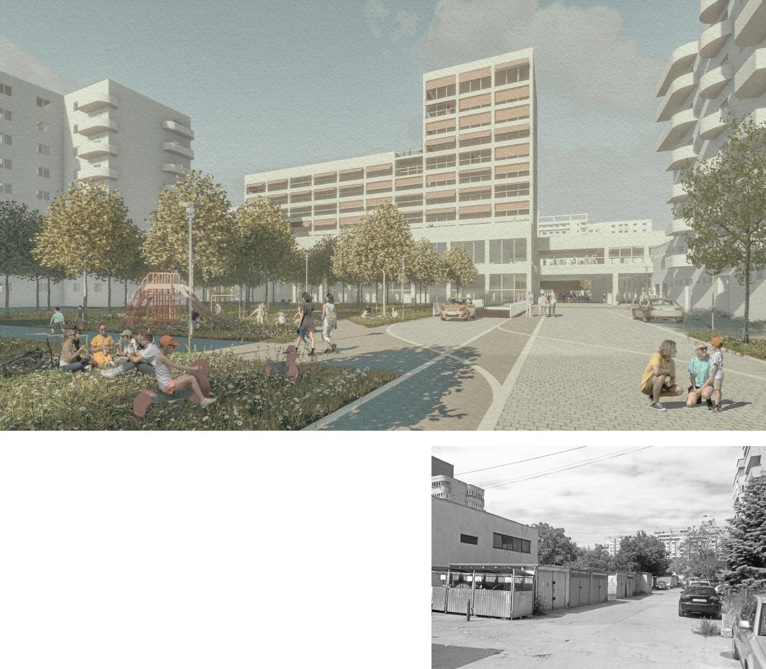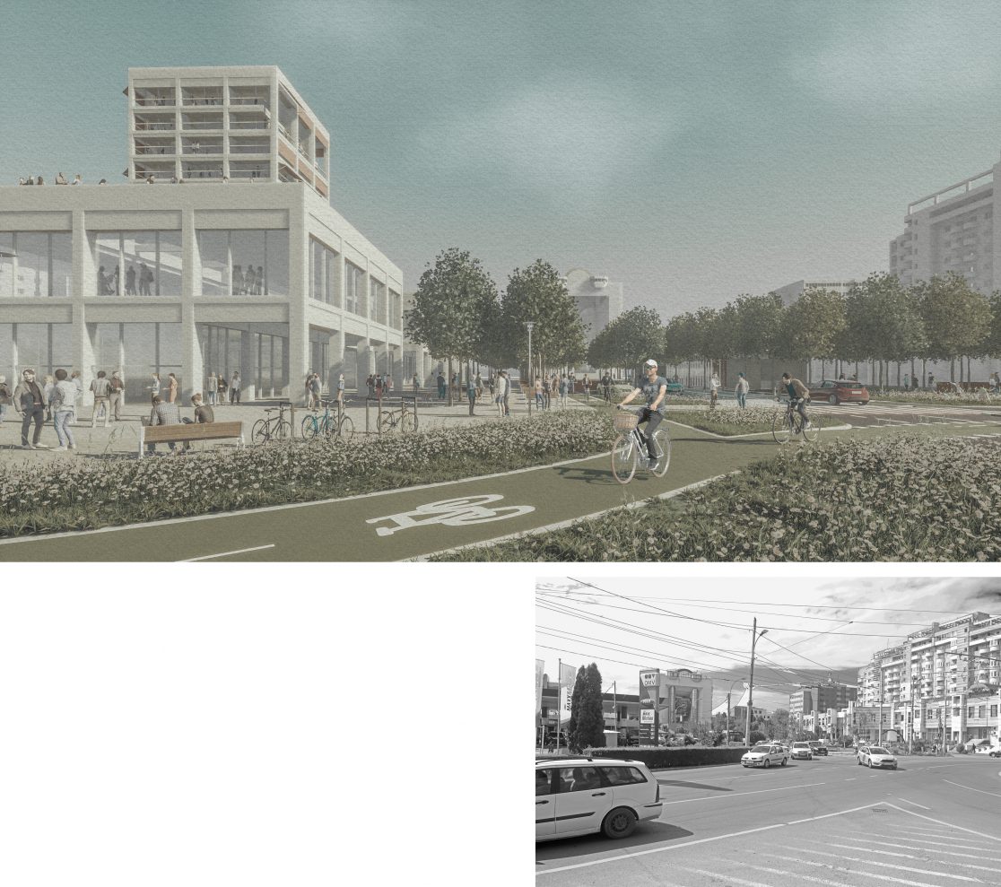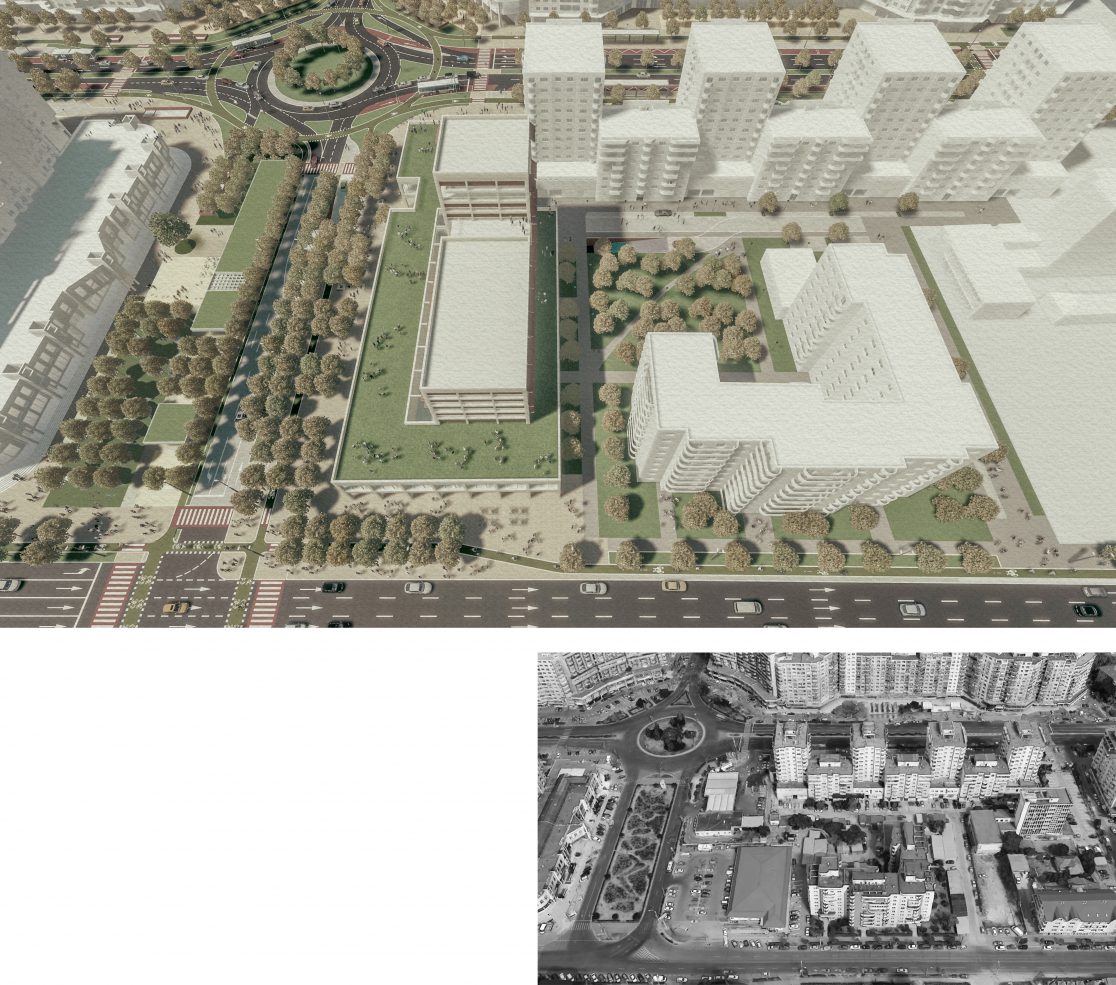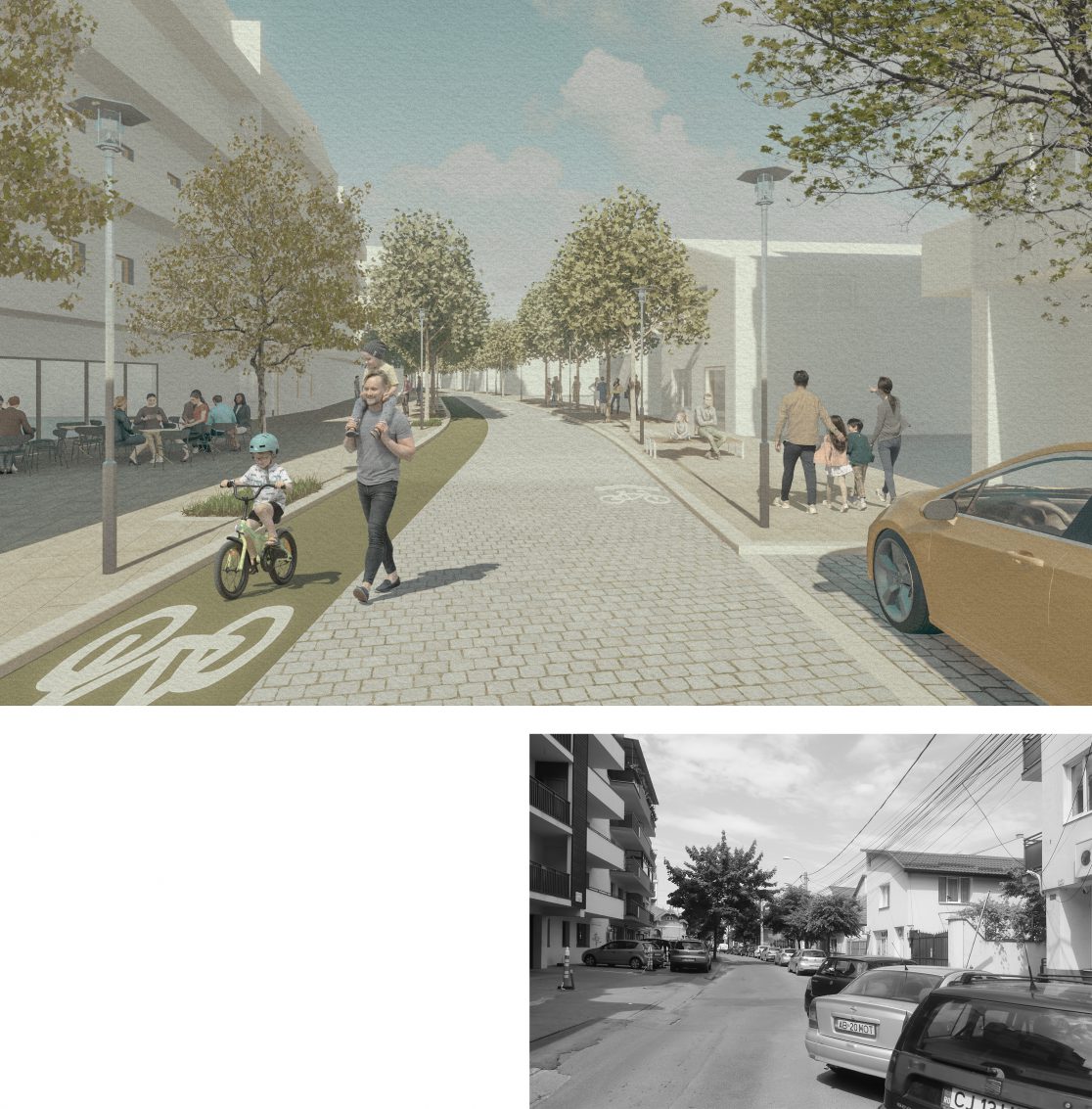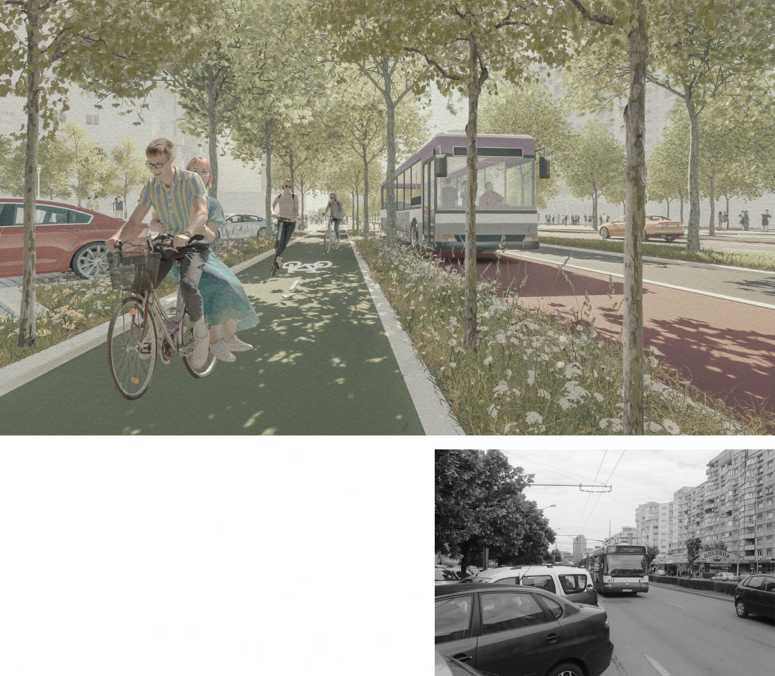 Regenerarea centrului de cartier Mărăști mizează pe concentrarea mașinilor în cinci parcaje noi de diferite tipuri, adaptate amplasamentelor disponibile. Reorganizarea spațiului public astfel eliberat prioritizează mobilitatea sustenabilă: pietoni, biciclete și transport public pe culoar dedicat. Suprafața spațiilor verzi este extinsă cu 30%. Un imobil cu locuințe sociale și dotări publice de cartier reconfigurează frontul estic al Pieței Mărăști, în încercarea de a reda coerență spațială ansamblului.